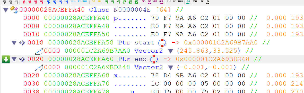 (As +0x18 and +0x20 are pointing to values that seem rather close, it's fair to assume they're start and end pointers)