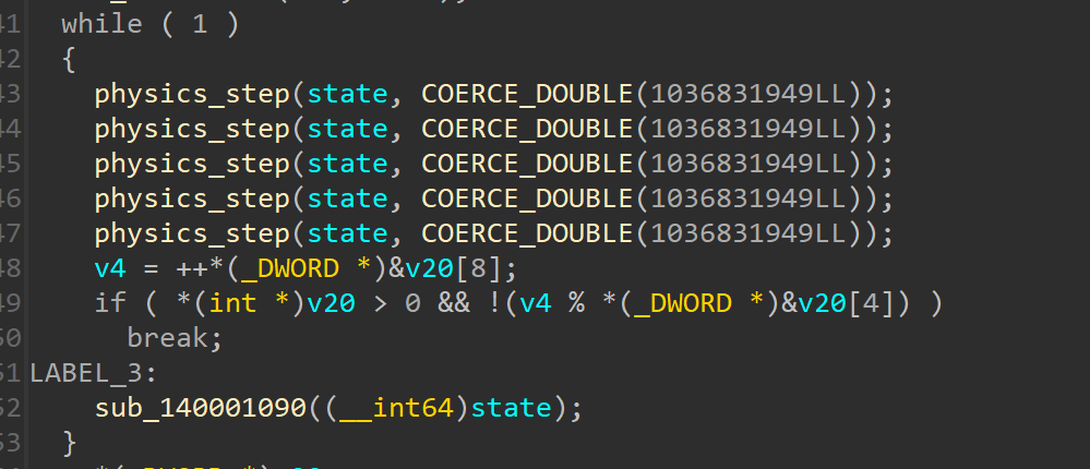 Taking a look at the binary in IDA, we can easily spot the main loop of the simulation.
